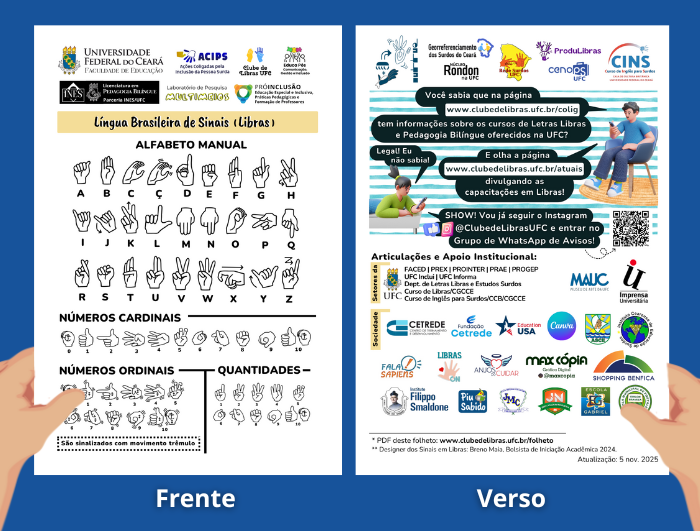 #PraCegoVer #PraTodosVerem: A imagem acima é um retângulo azul marinho que apresenta a figura de duas mãos pardas demonstrando a frente e o verso do folheto. NA FRENTE há o brasão da Universidade Federal do Ceará – Faculdade de Educação; o logotipo do projeto de Extensão ‘Educa Pós – Comunicação, Gestão e Inclusão’, o logotipo do Instituto Nacional de Educação de Surdos (INES) agregado ao Brasão da UFC e ao Curso de Pedagogia Bilíngue (uma parceria do INES e da UFC); embaixo destes, o logotipo do Clube de Libras UFC; o logotipo do Laboratório de Pesquisa Multimeios; o logotipo do Grupo ‘Pró-Inclusão: Educação Especial e Inclusiva, Práticas Pedagógicas e Formação de Professores’; embaixo deste o texto ‘Língua Brasileira de Sinais (Libras)’; embaixo deste o texto ‘Alfabeto Manual’ seguido dos sinais em Libras do mesmo; embaixo deste, em Libras, os números cardinais, ordinais e as quantidades. Embaixo dos números ordinais, há a explicação “São sinalizados com movimento trêmulo”. NO VERSO há os logotipos do Departamento de Letras Libras e Estudos Surdos (DELLES) da UFC; do projeto projeto de Extensão ‘Georreferenciamento dos Surdos do Ceará’ (GeoSurdosCE); do programa de Extensão ‘Núcleo Rondon na UFC’; do projeto de Extensão ‘Rede Surdos-CE: Sinalário Escolar e Acadêmico’; do projeto de Inovação ‘Centro de Negócios e Oportunidades para a Pessoa Surda’ (CENOPS UFC); do projeto de Extensão ‘ProduLibras: Produção de Material Didático para o Ensino de Libras na Academia’; e do Curso de Inglês para Surdos da Casa de Cultura Britânica/UFC. Estes logos estão descritos detalhadamente na página www.clubedelibras.ufc.br/colig. Abaixo dos logos, há a representação ilustrativa de dois jovens conversando através de mensagens no celular. O diálogo inicia-se com o rapaz perguntando: ‘Você sabia que na página www.clubedelibras.ufc.br/colig tem informações sobre os cursos de Letras Libras e Pedagogia Bilíngue oferecidos na UFC? Então a moça responde: ‘Legal! Eu não sabia!’ O rapaz, então, diz: ‘E olha a página www.clubedelibras.ufc.br/atuais divulgando as capacitações em Libras!’ A moça finaliza: ‘SHOW! Vou já seguir o Instagram @ClubedeLibrasUFC’. Após o diálogo, há o texto “Articulações e Apoio Institucional” acompanhado das siglas dos seguintes setores da UFC: Faculdade de Educação (FACED); Pró-Reitoria de Extensão (PREX); Pró-Reitoria de Relações Interinstitucionais (PROINTER); Pró-Reitoria de Assistência Estudantil (PRAE); Pró-Reitoria de Gestão de Pessoas (PROGEP); Secretaria de Assessibilidade (UFC Inclui); Coordenadoria de Comunicação e Marketing (UFC Informa); Dept. de Letras Libras e Estudos Surdos (DELLES); Curso de Libras da Coordenação Geral das Casas de Cultura Estrangeira (CGCCE); Curso de Inglês para Surdos da Casa de Cultura Britânica (CCB) da CGCCE. À direita há ainda os seguintes logotipos: Museu de Arte da UFC (MAUC); Sistema de Bibliotecas (Biblioteca Universitária da UFC); Imprensa Universitária; Fundação CETREDE | Centro de Treinamento e Desenvolvimento; Education USA; Canva; Associação dos Surdos do Ceará (ASCE); Instituto Cearense de Educação de Surdos (ICES); Fala Sapiens; Libras ON; Anjos do Cuidar; Max Cópia; Shopping Benfica; Instituto Filippo Smaldone; Piu Sabido; E.E.F.M. Prof. Jáder de Carvalho; E.E.E.P. Joaquim Nogueira; E.E.M. Prof. Gabriel Epifânio dos Reis; e Escola Municipal de Fortaleza Odilon Braveza.