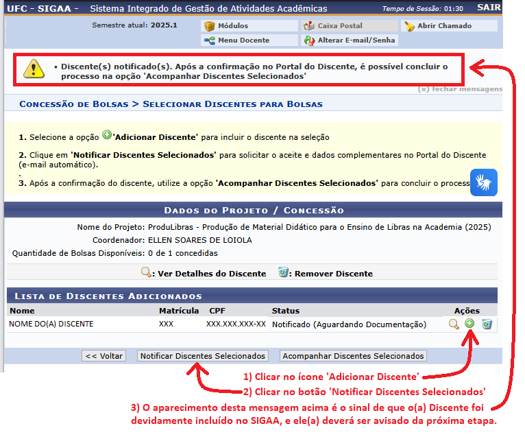 SIGAA > Concessão de Bolsas > Ações de Coordenador > Selecionar Discentes – selecionar o(a) discente selecionado(a) > Incluir o(a) Discente > Notificar o(a) Discente